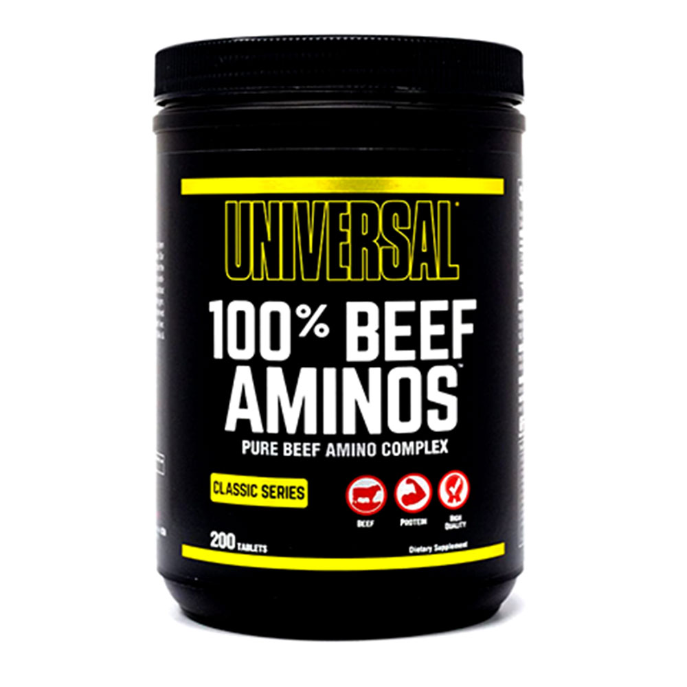 شرکت Universal با ساخت و تولید 100% Beef Aminos یونیورسال منبع پروتئین کاملی را برای بدن سازان محیا کرده است .هر قرص آمینو بیف 100% یونیورسال ترکیبی از آمینه اسید های گوشتی مهم و دیگر مواد مغذی ضروری است که از بالاترین کیفیت پروتئین گوشت گاو ، کنسانتره آلبومین گوشت گوساله و گوشت کبد گاو گرفته شده است .